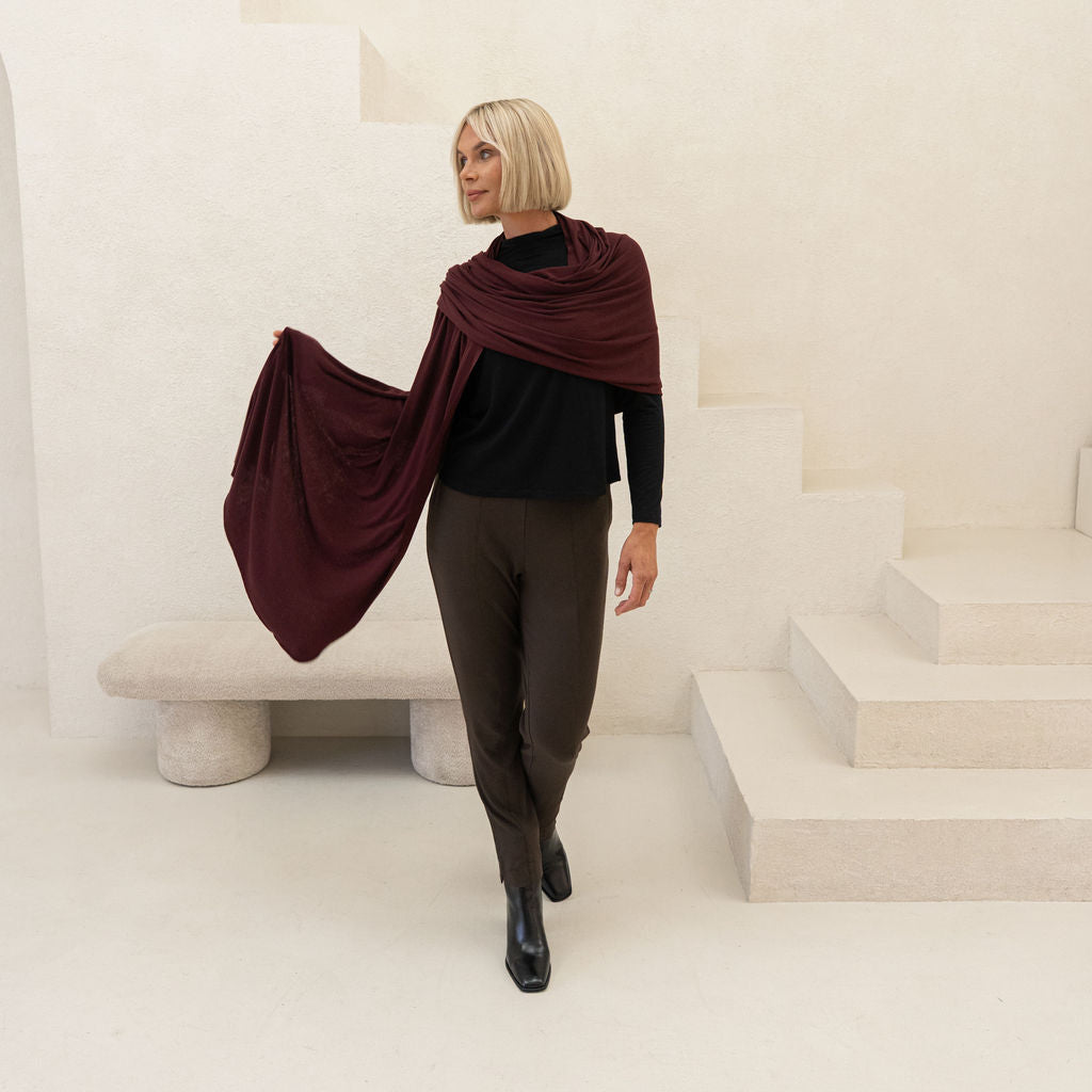 The Jetsetter Wrap is made from TENCEL™ Lyocell Merino Wool Stretch Jersey, a blend of 65% TENCEL™ Lyocell, 28% Merino Wool, and 7% Spandex. Naturally thermoregulating, odour-resistant, and luxuriously soft, this lightweight fabric is easy to pack and keeps you warm without overheating—perfect for any climate.