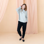 Woman wearing long sleeve blue cardigan with white scoop neckline shirt and grey wide leg pants
