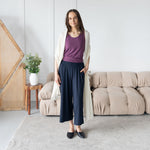 Woman wearing long sleeve blue cardigan with white scoop neckline shirt and grey wide leg pants