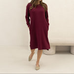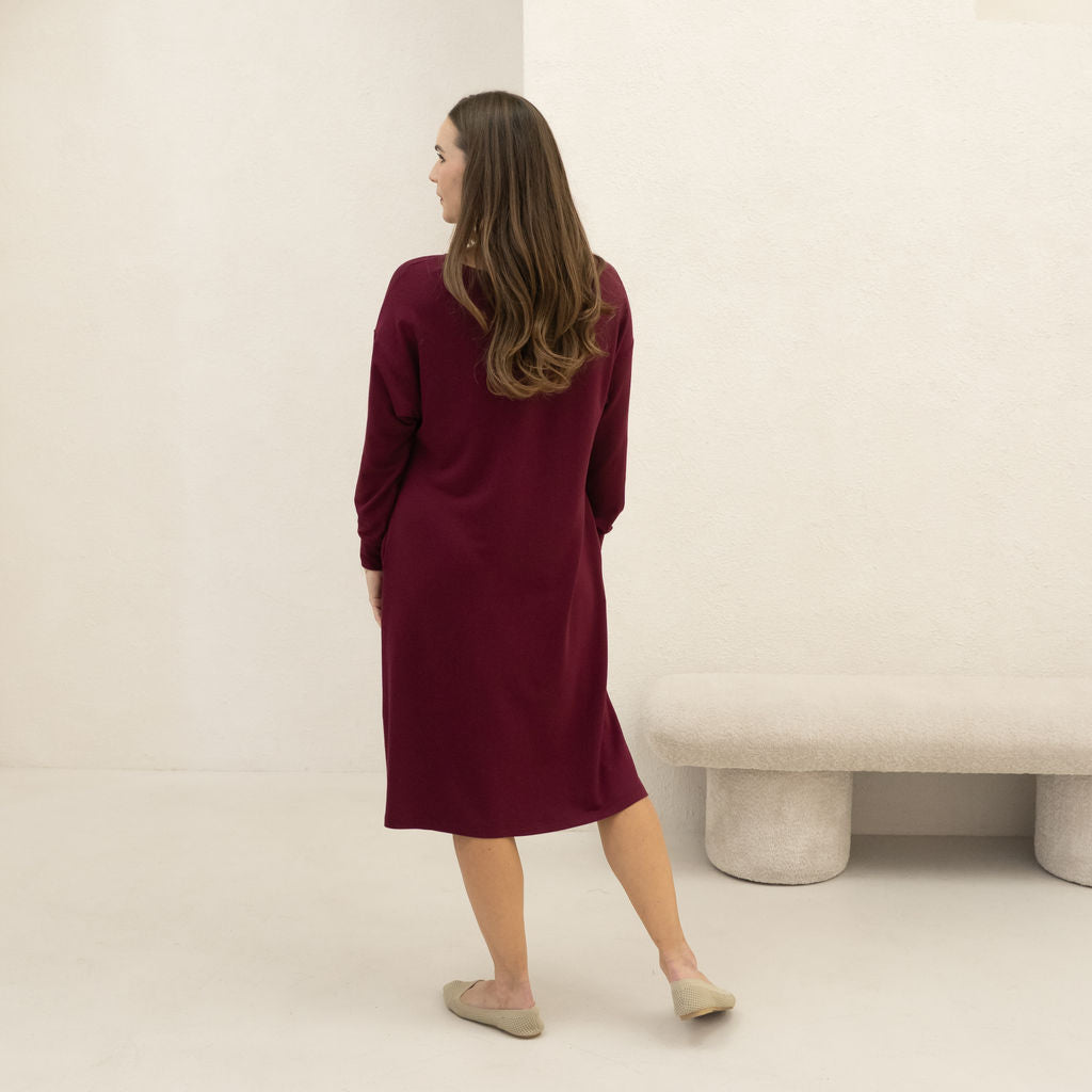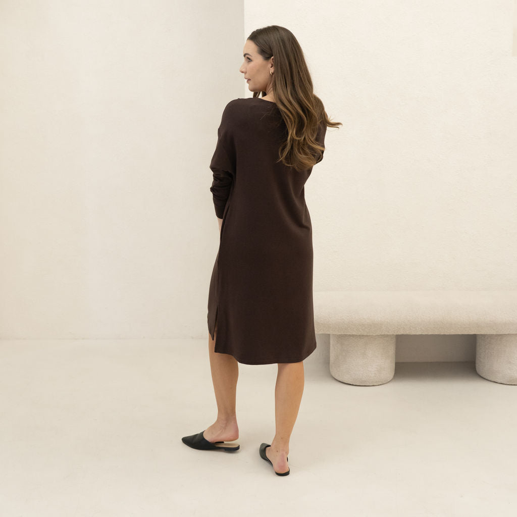 An elevated long sleeve midi dress that feels like your favourite sweatshirt. Tailored but effortless, it skims without clinging, with a subtle high-low hem that flatters and moves. Two pockets keep it practical. Dress it up for work or keep it low-key on weekends—either way, you look polished and stay comfortable.