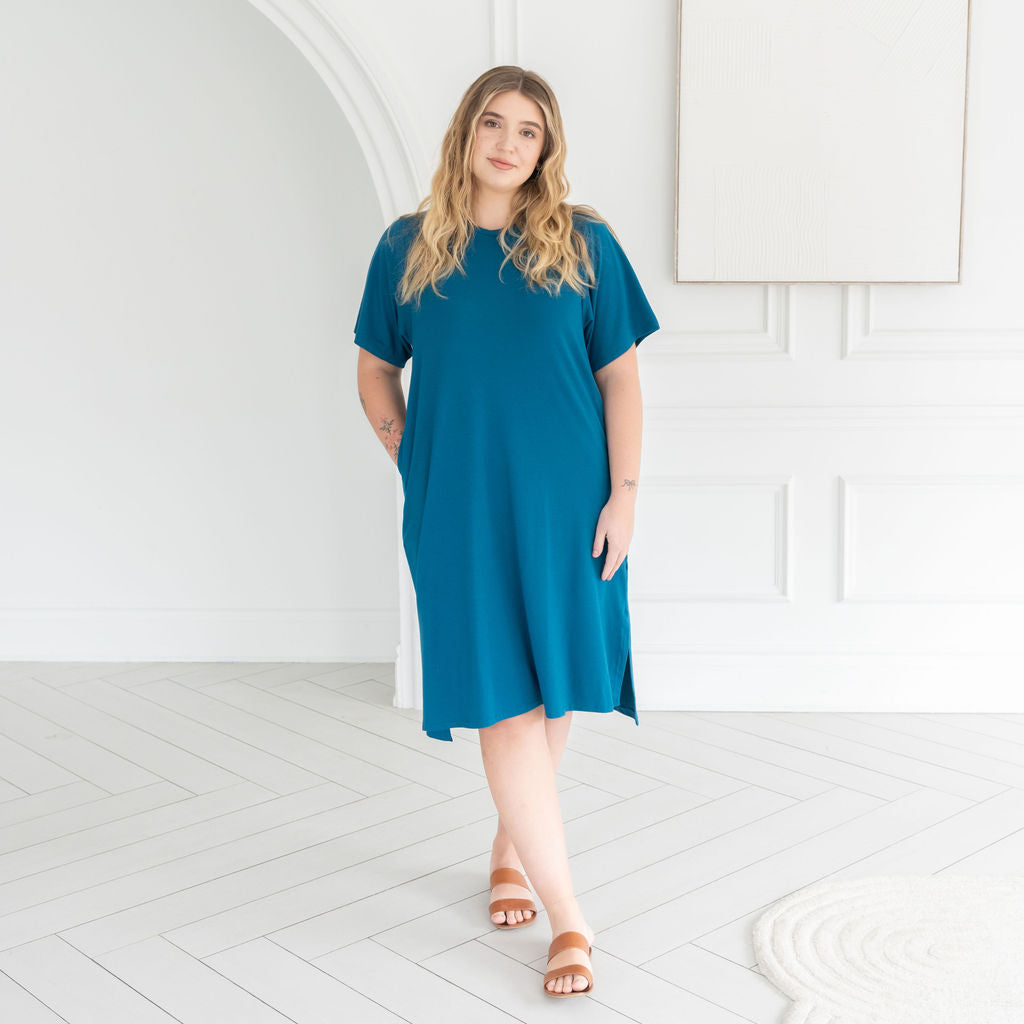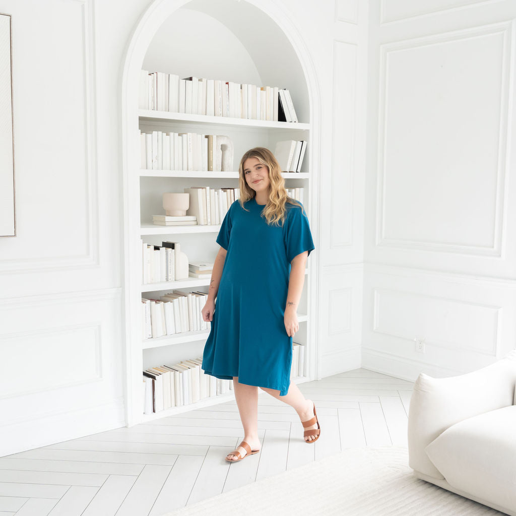 The All Day Midi T-Shirt Dress combines comfy T-shirt vibes with an effortlessly elevated silhouette. With a soft drape, flattering high-low hem, and modern longer short sleeves, it moves with you from workdays to weekends. Crafted in our breathable Bamboo cotton blend fabric— this is the kind of dress you live in. It's your everyday uniform, upgraded.