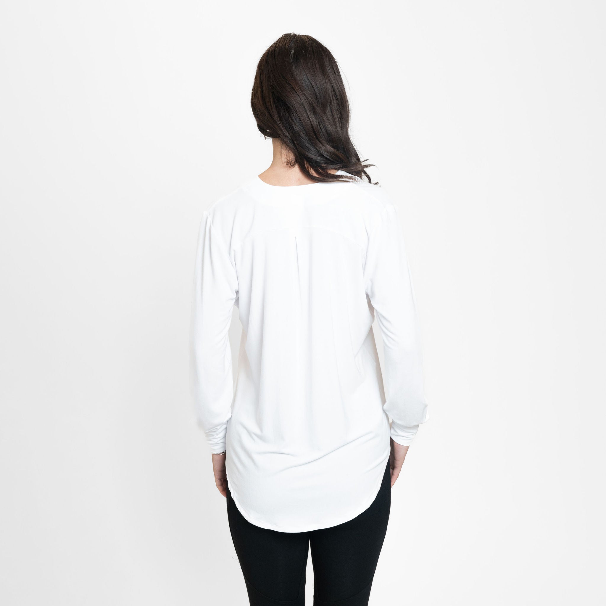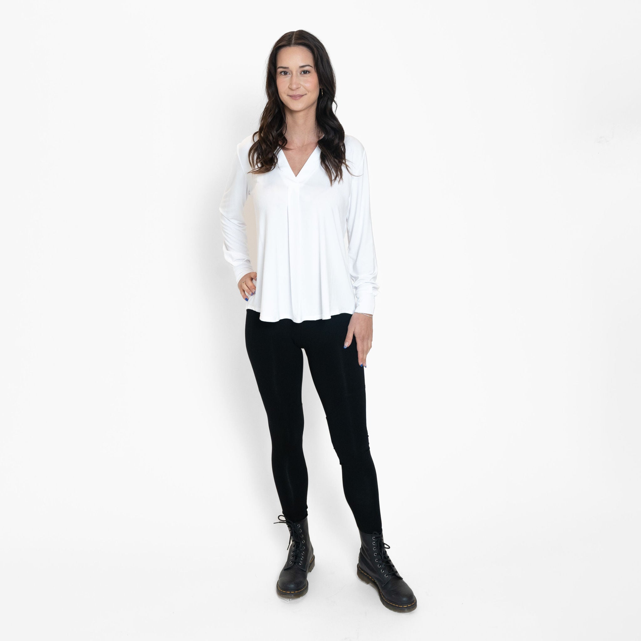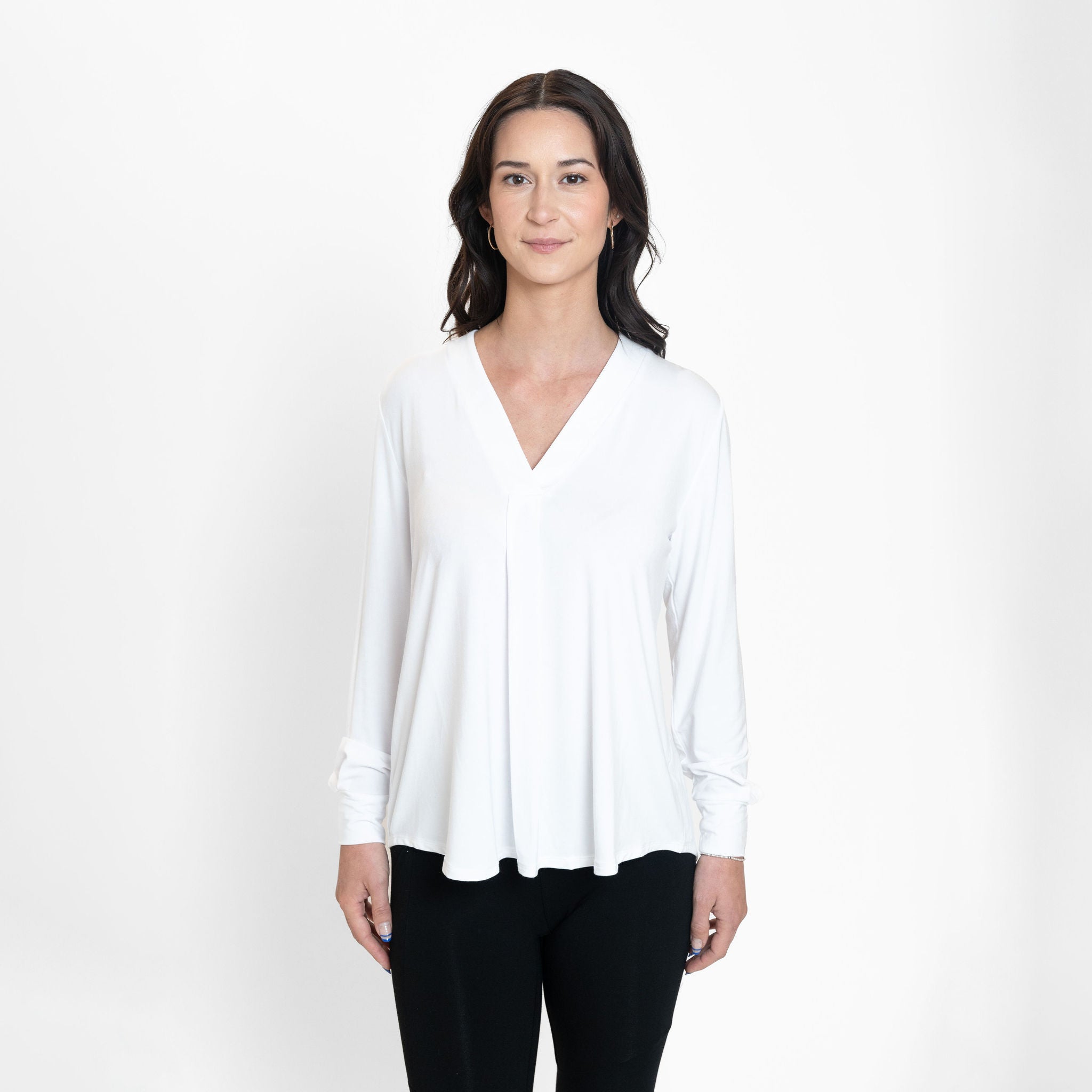 Flattering v-neckline with front pleats creates the illusion of a formal dress shirt.