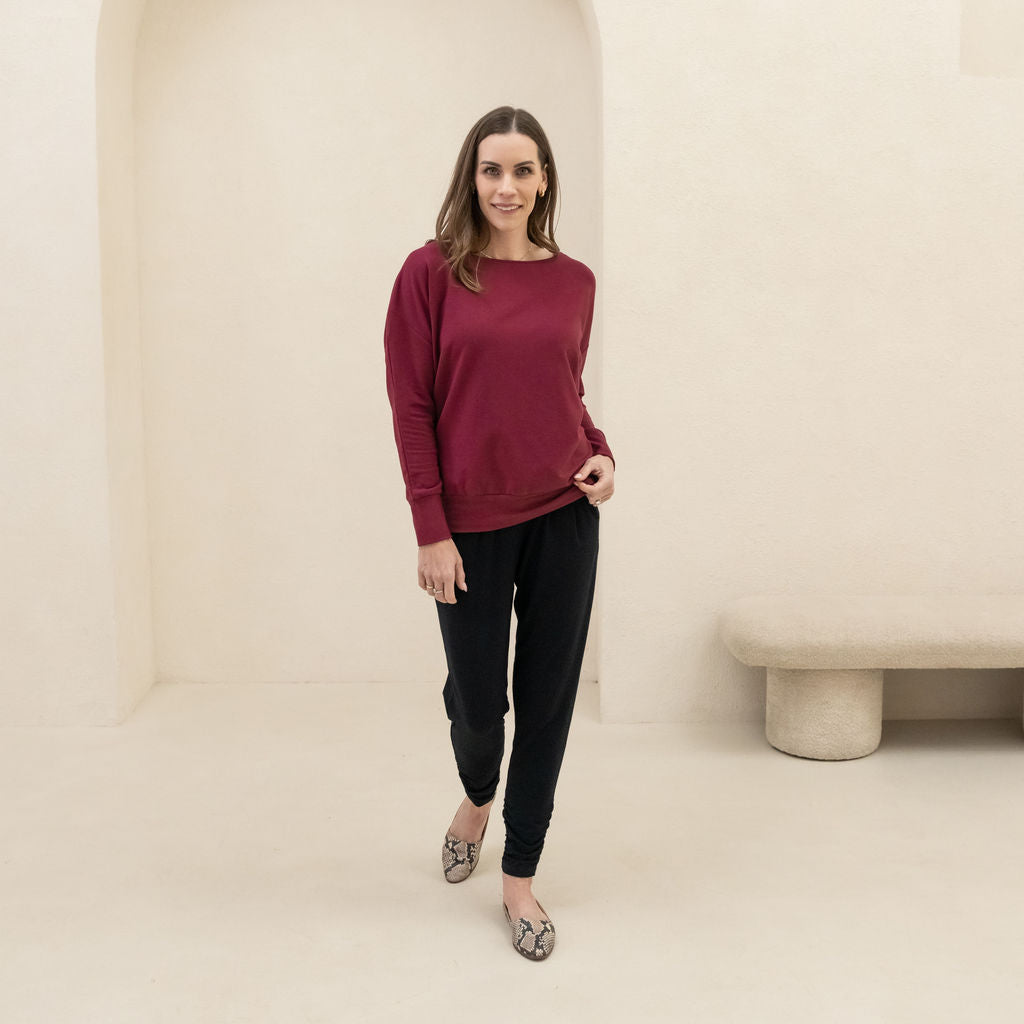 The Dressy Sweatshirt in MERINO is made from a French Terry blend of Rayon from Bamboo, Merino Wool and Spandex. The Merino Wool is non-mulesed, and cruelty-free. The fabric is OEKO-TEX® STANDARD 100 certified to be free from harmful chemicals.