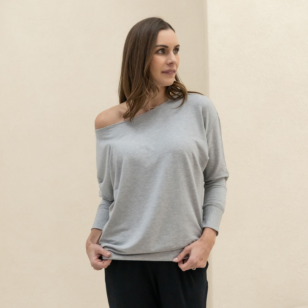 - A flattering, wide neckline offering you two looks: boatneck or off the shoulder.