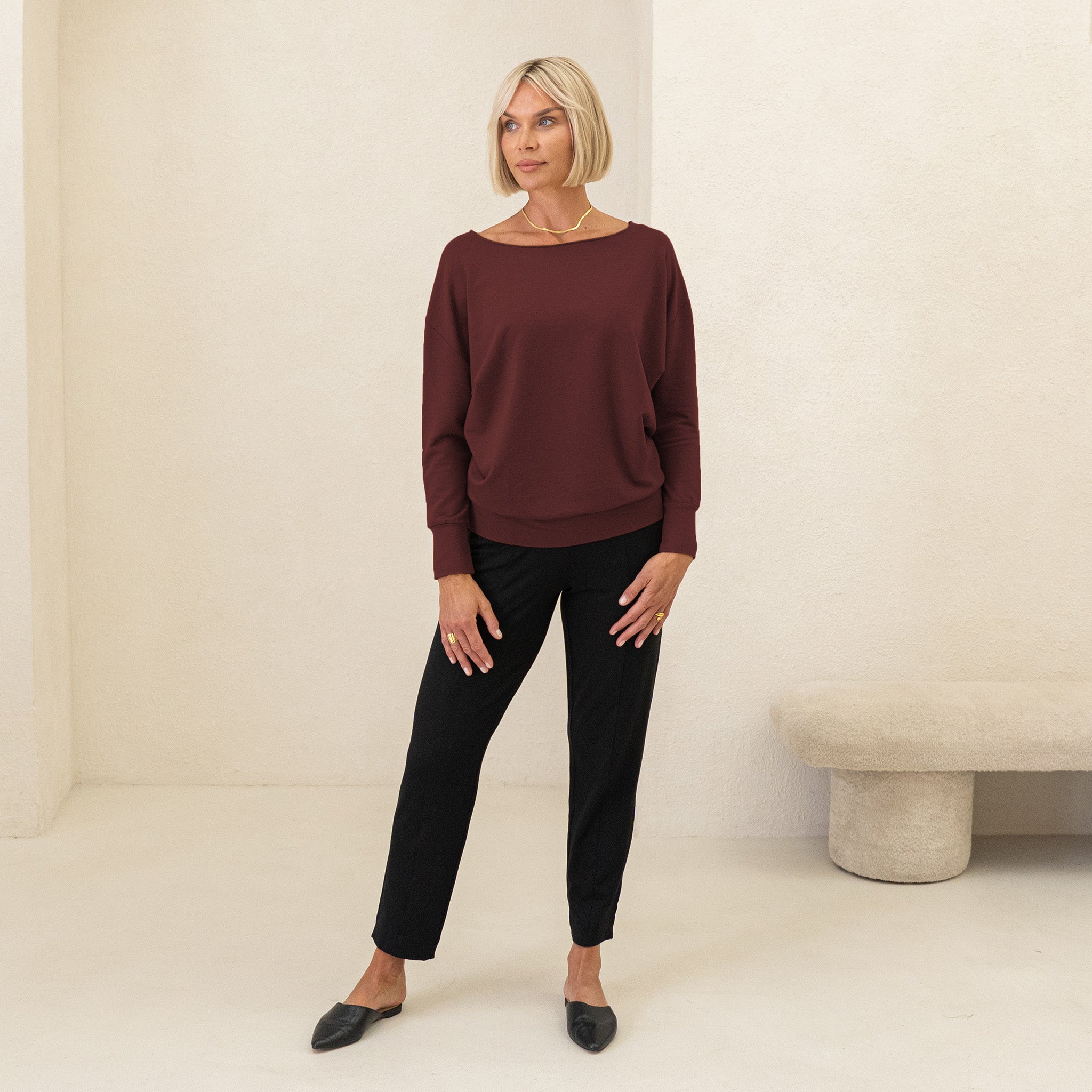 The Dressy Sweatshirt in MERINO is made from a French Terry blend of Rayon from Bamboo, Merino Wool and Spandex. The Merino Wool is non-mulesed, and cruelty-free. The fabric is OEKO-TEX® STANDARD 100 certified to be free from harmful chemicals.