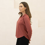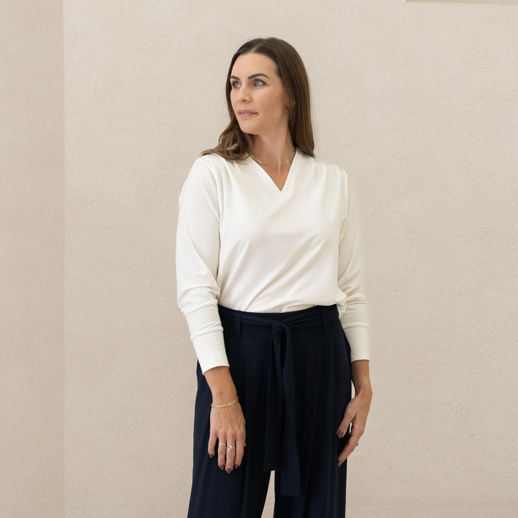 The Gather Blouse offers a relaxed yet refined fit with light structure through the shoulders and subtle draping through the body. Designed to skim without clinging, it falls to the high hip for an easy, polished silhouette.