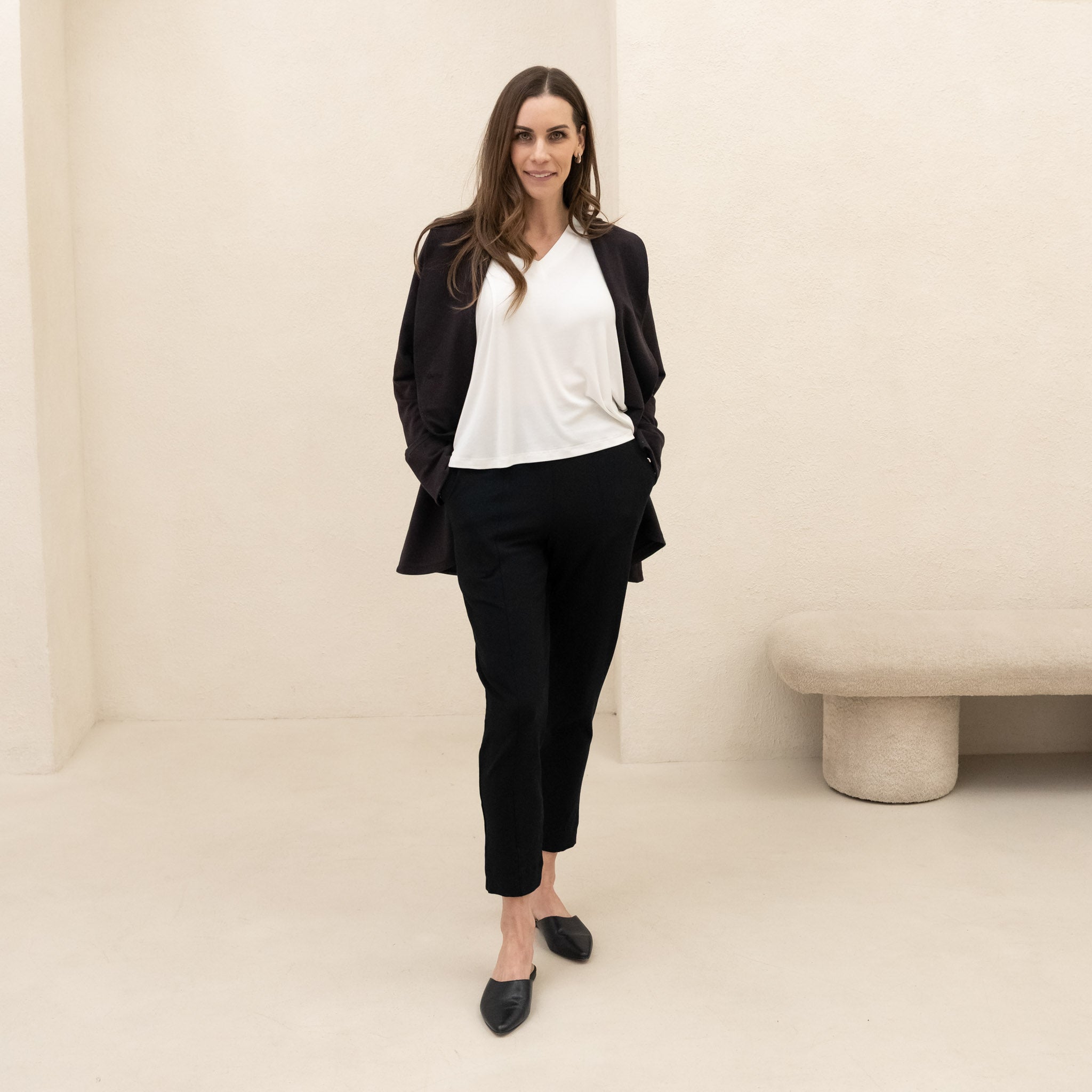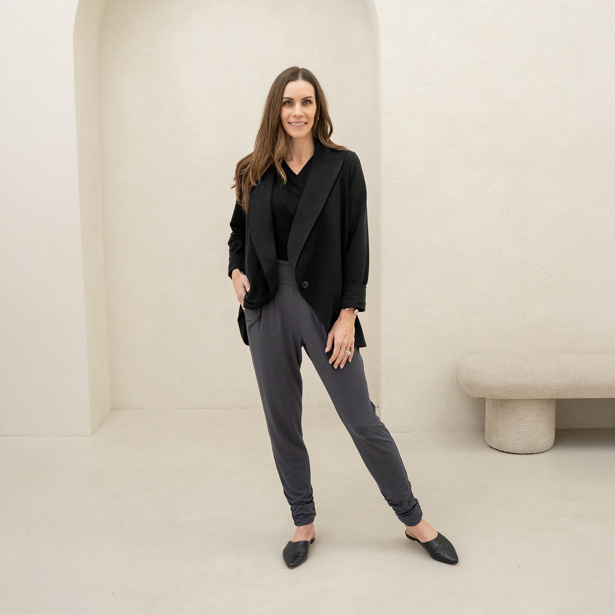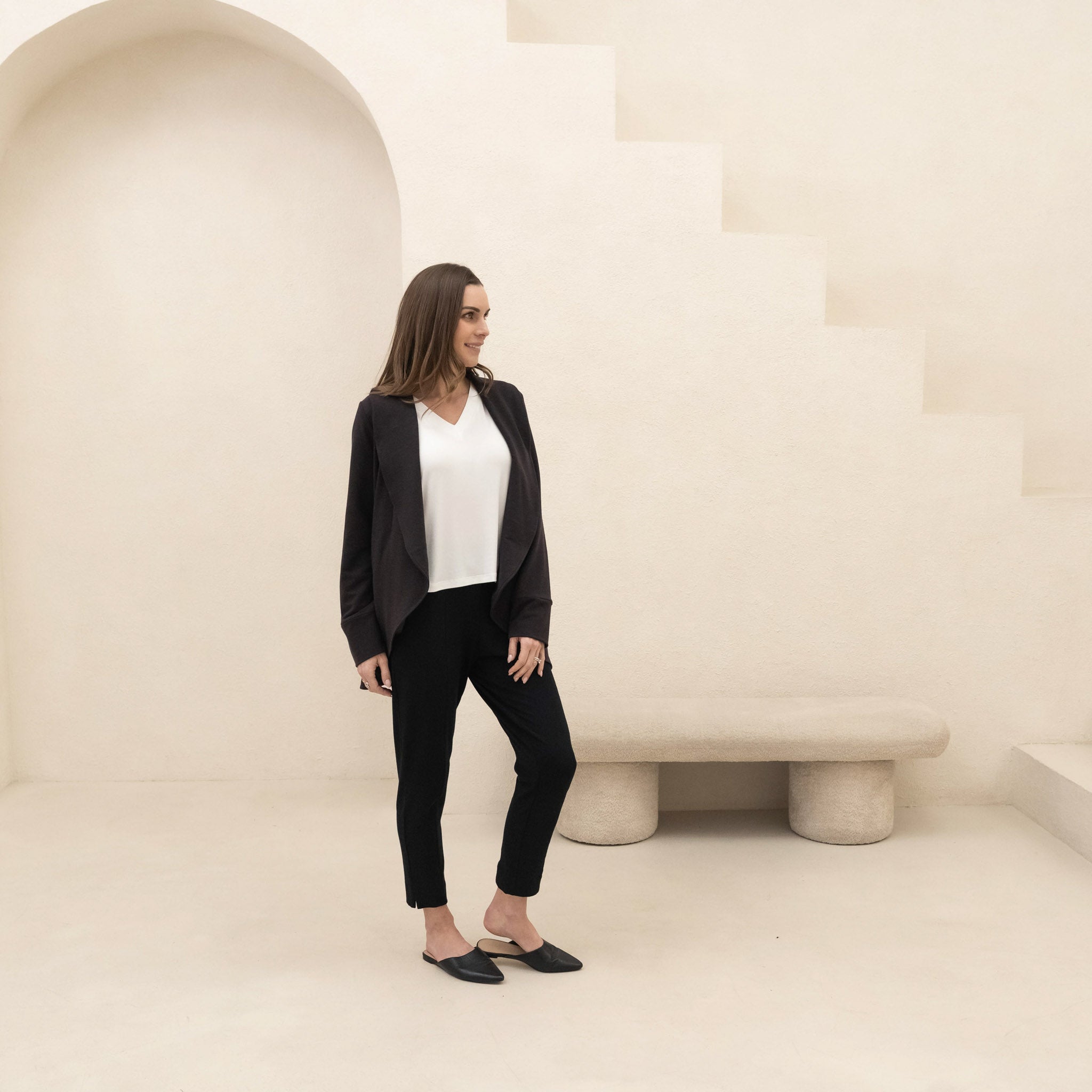 We use premium, breathable fabrics and design pieces to last—so they keep their shape, softness, and polish wear after wear. Cut + sewn in Canada in small batches for craftsmanship you can count on.