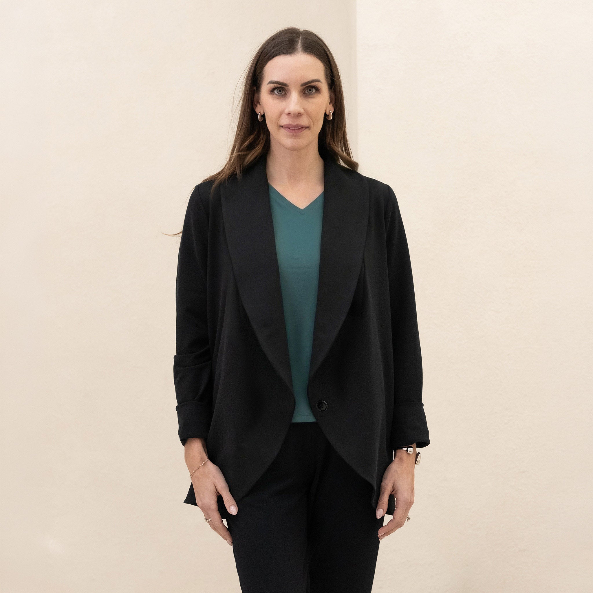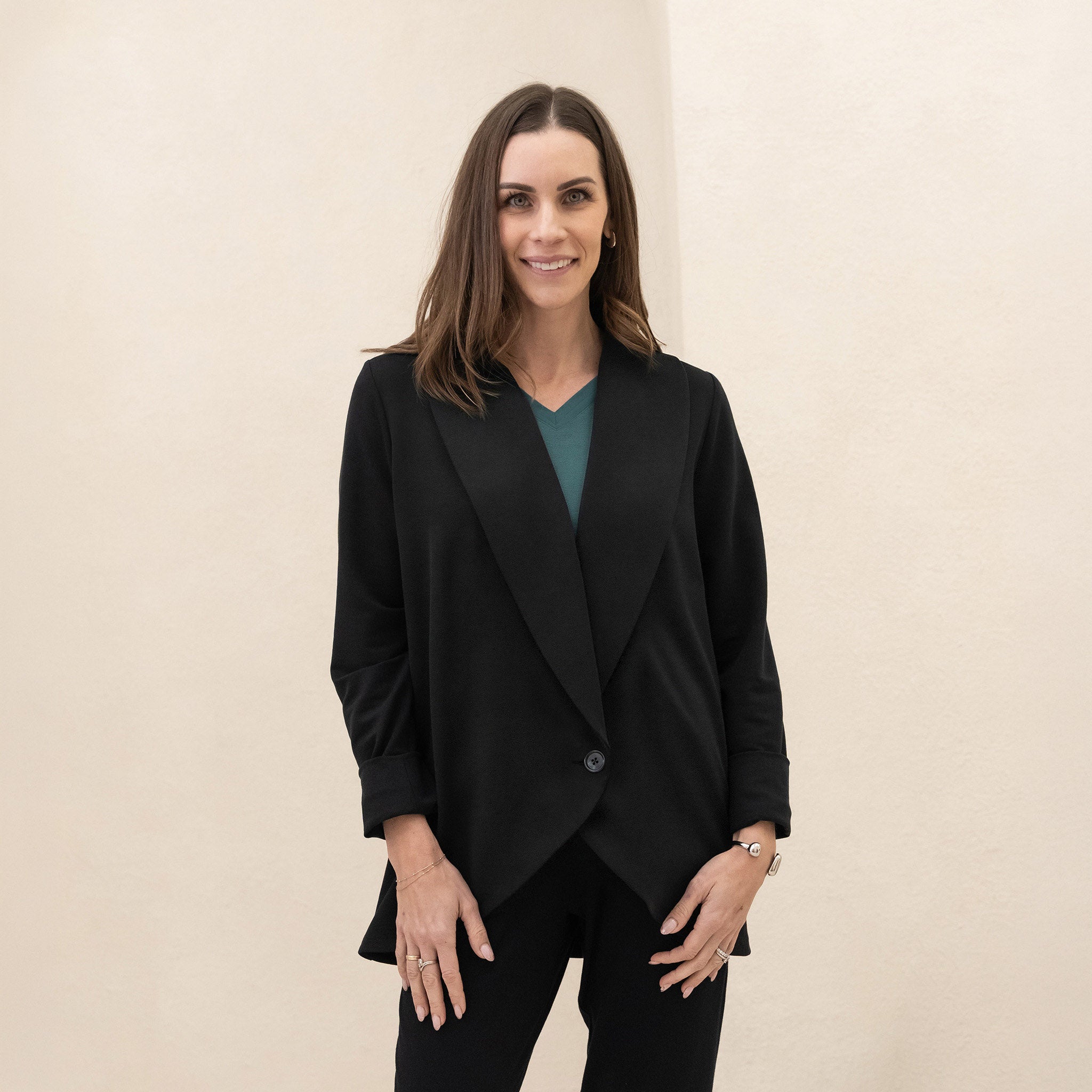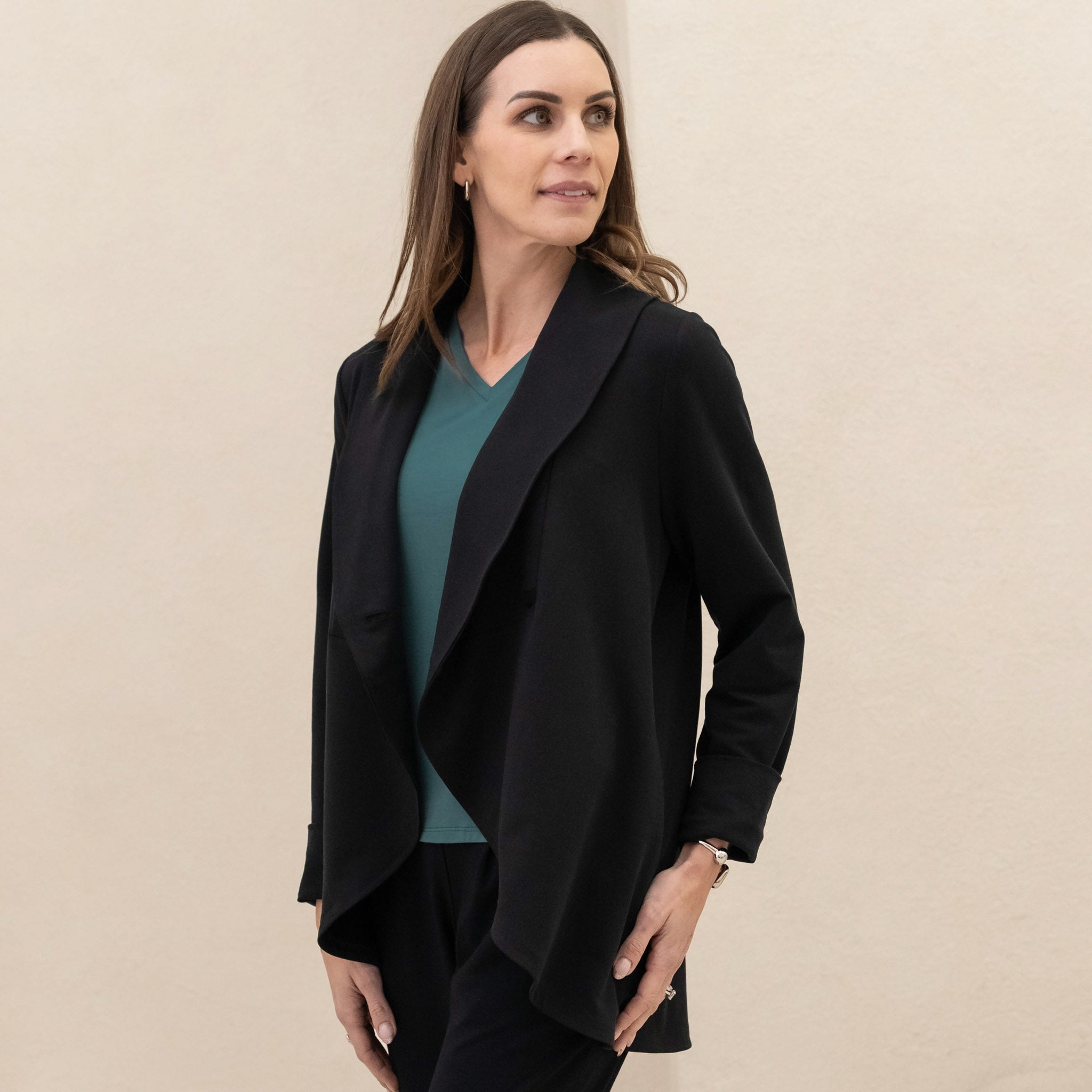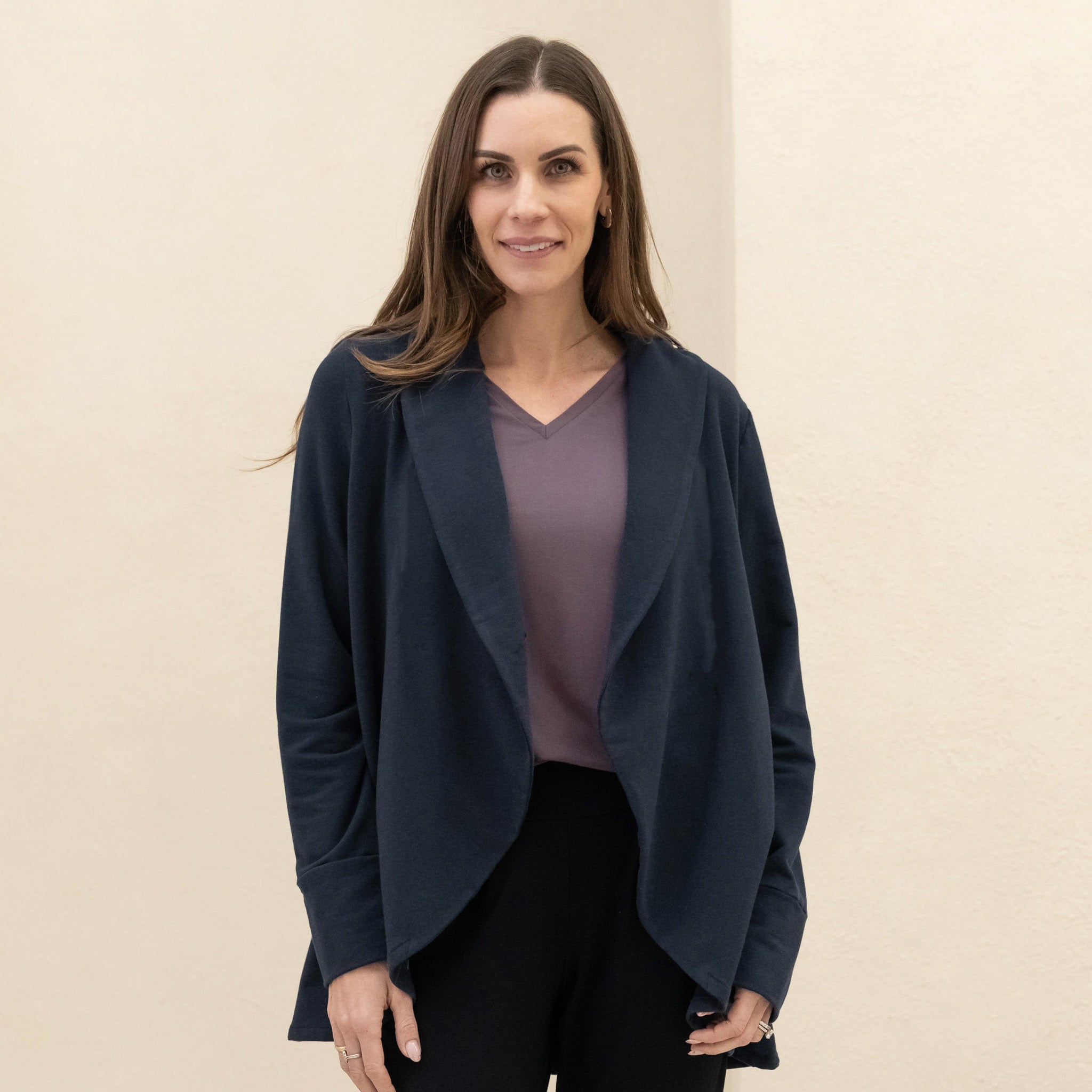 Meet the blazer that feels like your favourite sweatshirt. Made from soft TENCEL™️ Lyocell Cotton French Terry, it features a shawl-style lapel, button front, pockets, cuffed sleeves, and a back vent. The relaxed boyfriend fit offers polished comfort with easy coverage—perfect for work, travel, and everything after.
